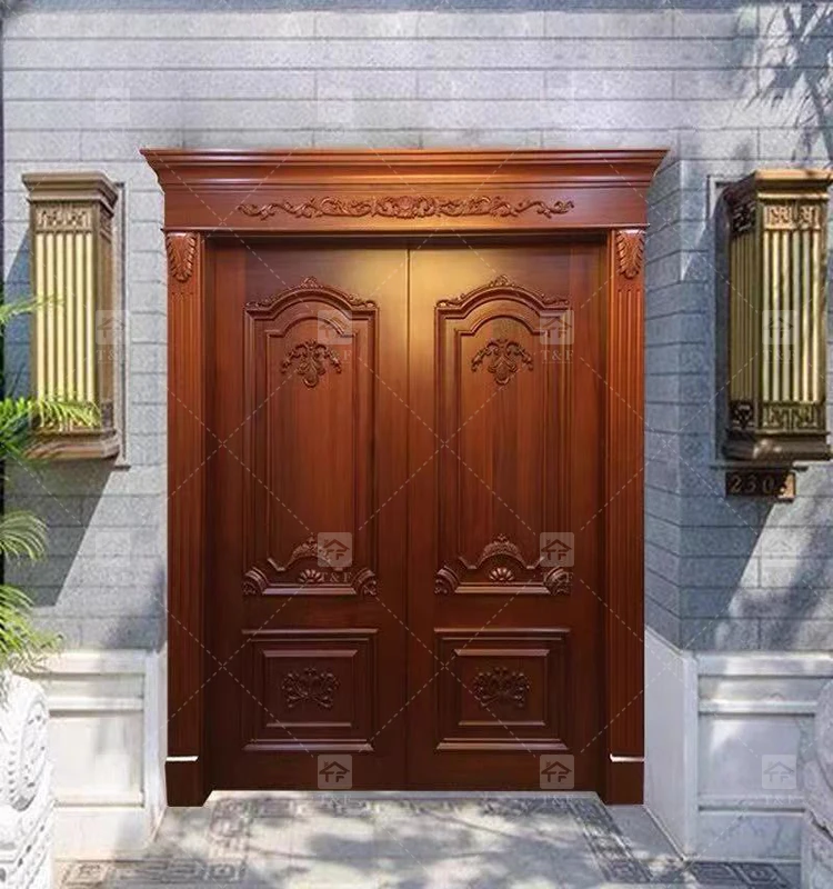 Cửa chính đôi gỗ hiện đại chạm khắc gỗ nguyên khối, chống thấm nước, dùng cho ngoại thất đã hoàn thiện.