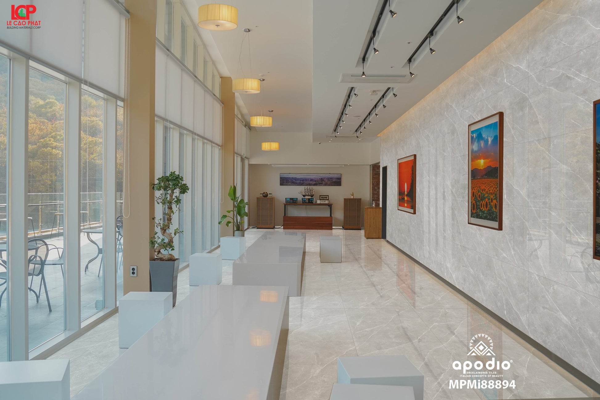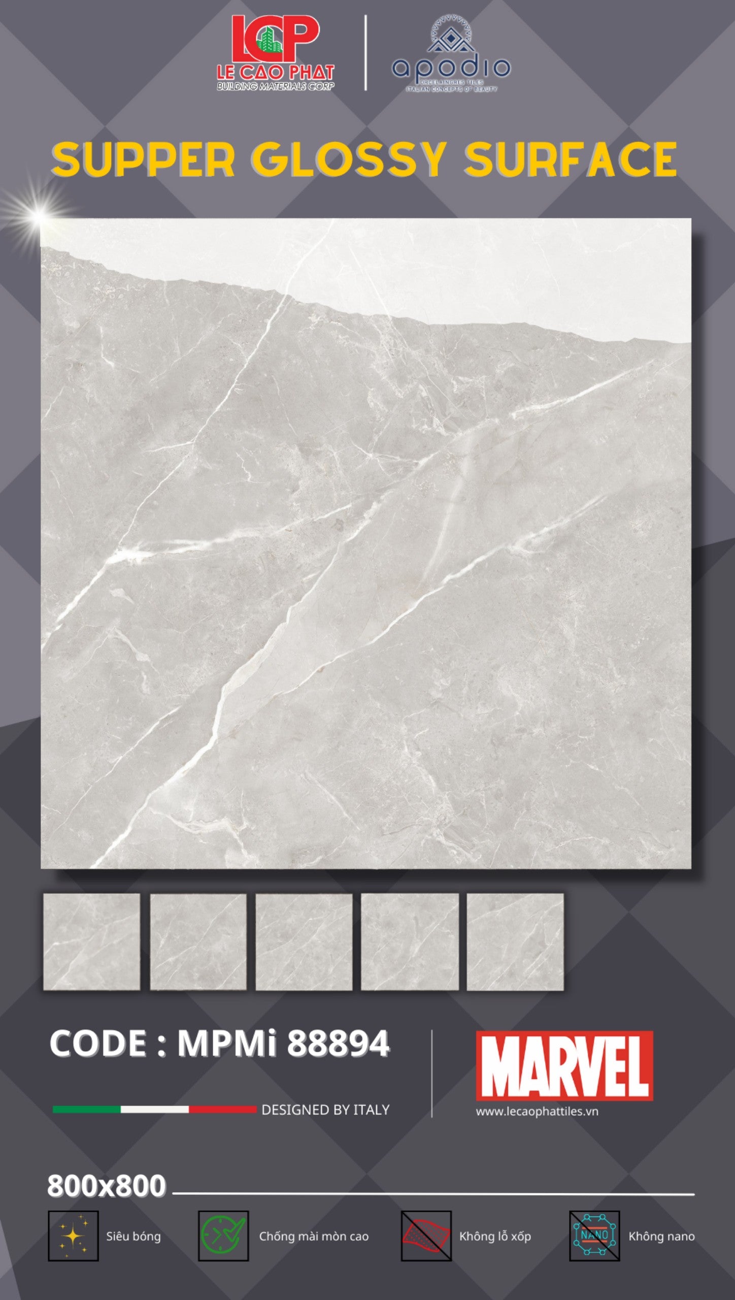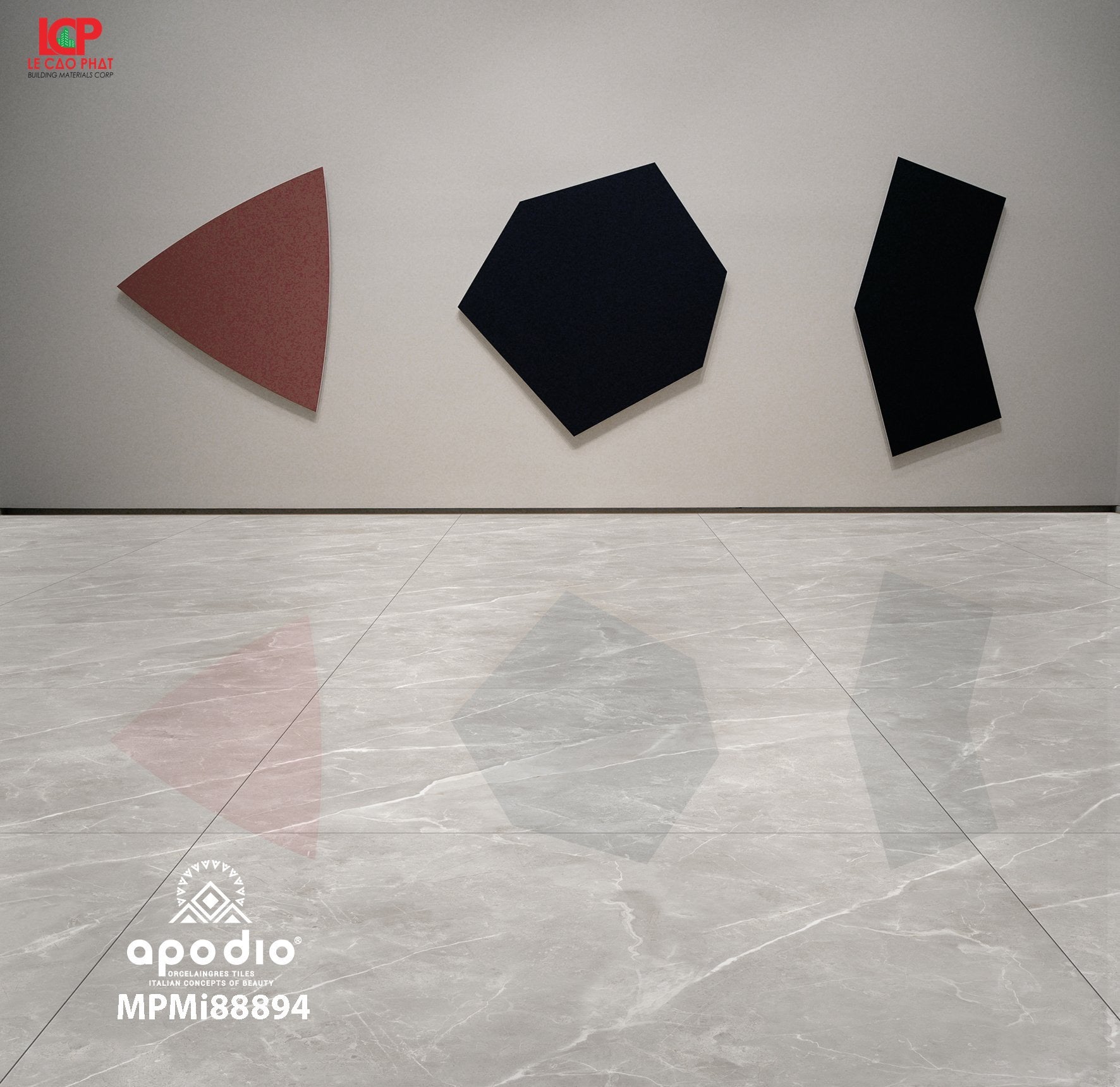 • Bề mặt siêu bóng với màu ghi nhạt nổi bật. Các họa tiết tinh tế làm nổi bật nền gạch.