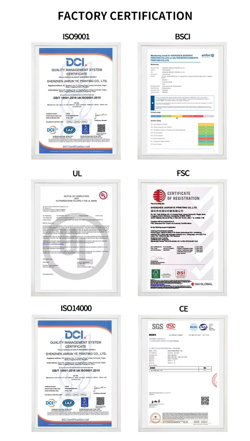 Chúng tôi là nhà sản xuất chuyên nghiệp với nhà máy tự sở hữu 5000 mét vuông. Chúng tôi có đầy đủ các thử nghiệm và chứng nhận như IS09001:2015, BSCI, FSC, UL, Clarity cho nhà máy và Dự luật California 65- Chì (Pb), CE, Chỉ thị RoHS (EU), v.v. cho các sản phẩm.