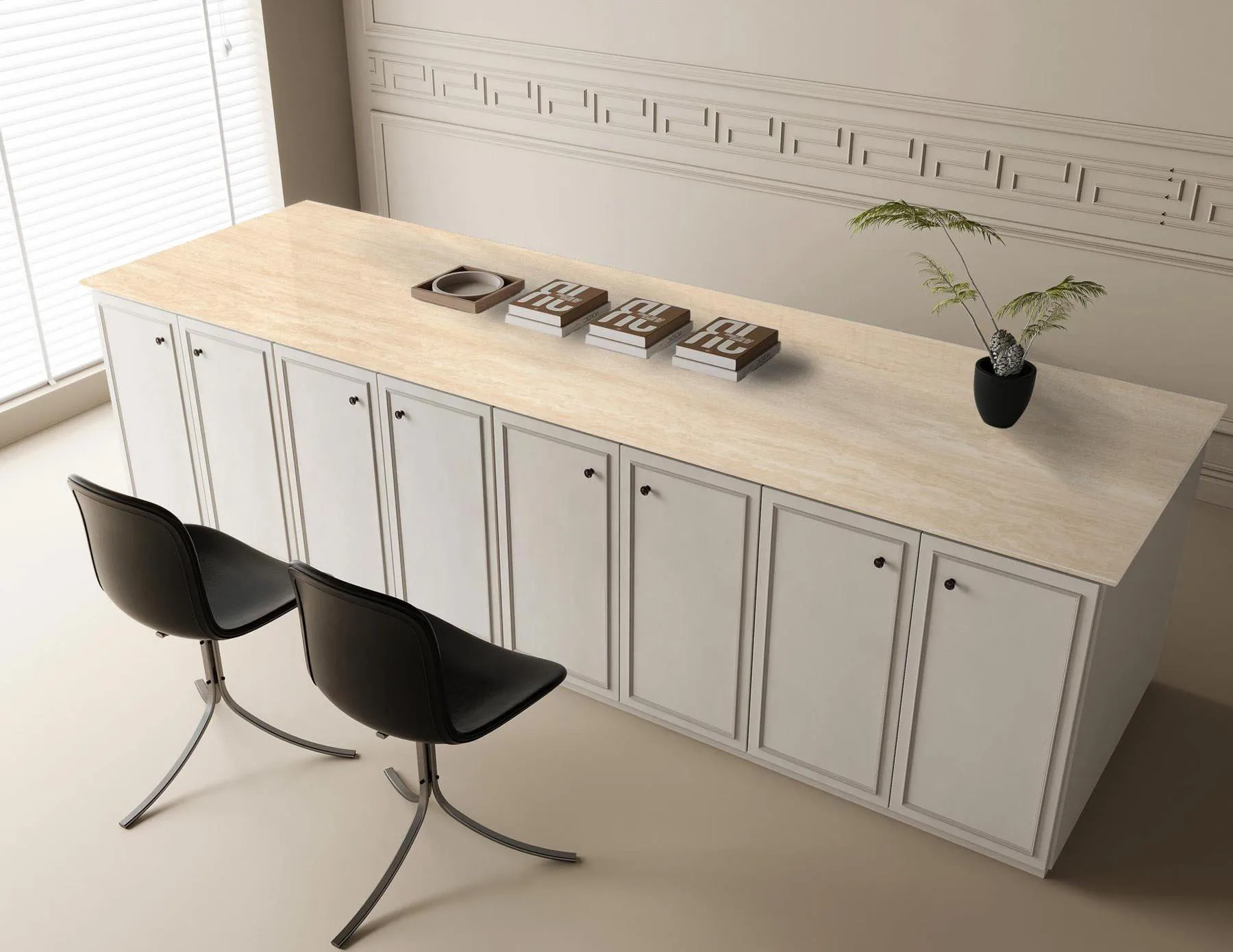 Tấm đá nung kết Travertine màu be vân tự nhiên cổ điển 1600x3200x12mm dùng cho mặt bàn văn phòng, bàn làm việc tại nhà