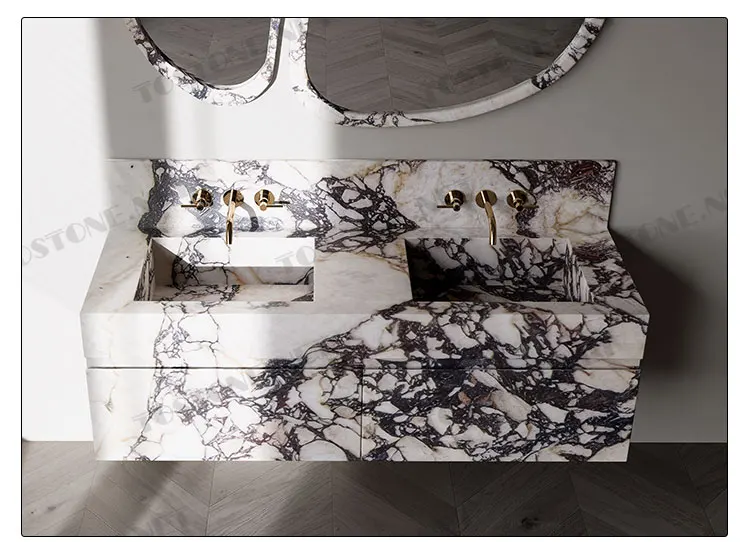 Tostone Mặt bàn chậu rửa phòng tắm gắn tường bằng đá cẩm thạch Calacatta Viola tự nhiên đẹp dành cho nội thất tùy chỉnh phòng vệ sinh nhỏ